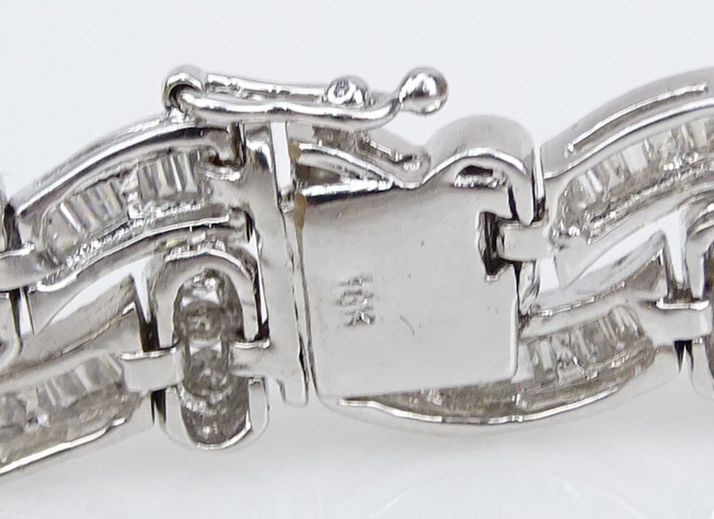 Approx. 8.50 Carat Baguette and Round Brilliant Cut Diamond and 18 Karat White Gold Bracelet. Stamped 8K. Good condition. Measures 7-1/2" L, 3/8" W. Approx. weight: 38.8 grams. Shipping $30.00 (estimate $3500-$5000)