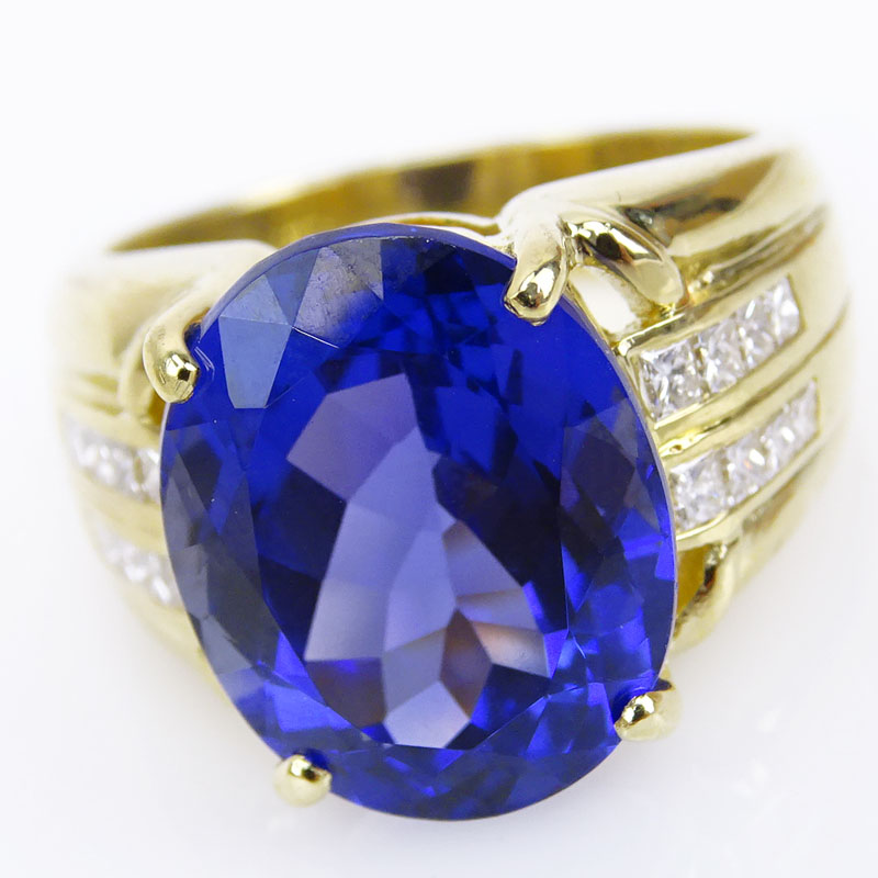Approximate 12.30 Carat Oval Cut Tanzanite, Princess Cut Diamond and 18 Karat Yellow Gold Ring. Tanzanite with vivid saturation of color. Stamped 18K. Good condition. Ring size 8. Approx. weight: 14.4 grams. Shipping $28.00 (estimate $4500-$6500)