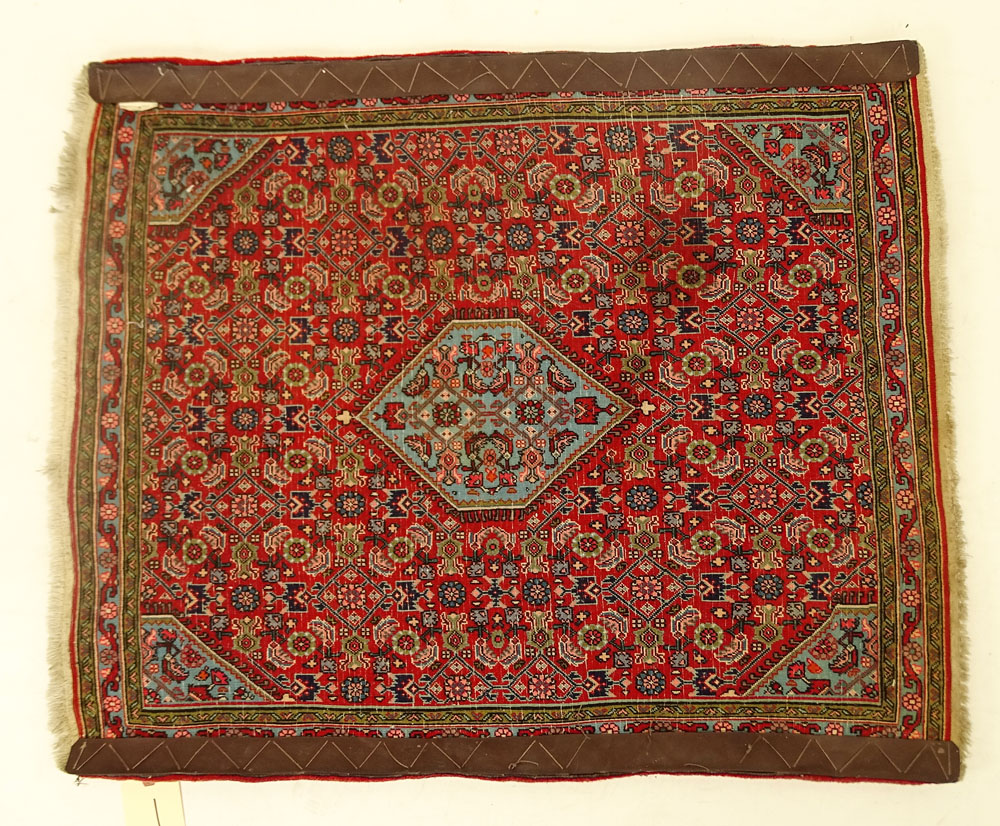 Small Semi Antique Persian Bijar Carpet with Turquoise Diamond Medallion. Tight weave. Unsigned. Good condition although in need of a cleaning. Measures 35" x 30". Shipping $65.00 (estimate $150-$250)