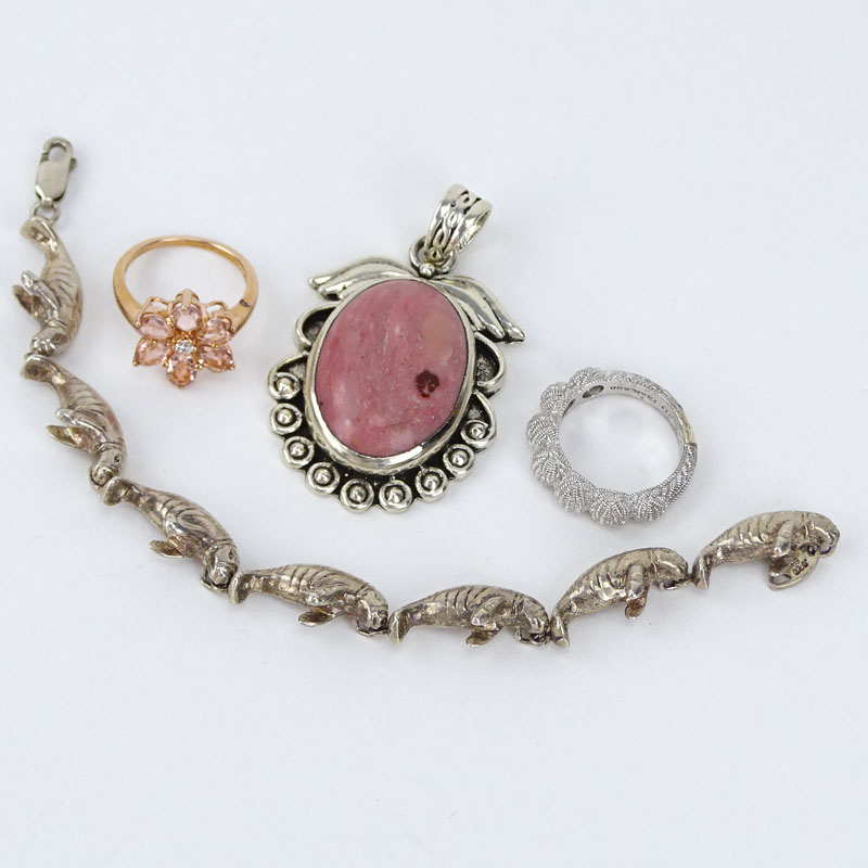 Four (4) Piece Sterling Silver Jewelry Lot Including a Manatee Bracelet, Ring, Vermeil Ring with Pink Stones and a Pendant with Pink Stone. Good condition. Ring size 6-1/2-7. Pendant measures 2" L, 1-1/4" W. Approx. weight: 46.0 grams. Shipping $32.00 (estimate $50-$100)