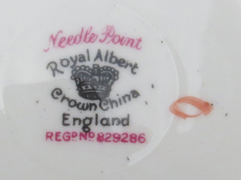 Assorted lot of Porcelain Tablewares. Includes Royal Albert "Needlepoint" 5 cups and 6 saucers and a small bowl, good condition; Spode creamer and sugar in silverplate holder, unsigned decanter (chips), unsigned cup and saucer (hairline). Condition as described. Decanter measures 4-5/8" H. Shipping $73.00 (estimate $25-$50)