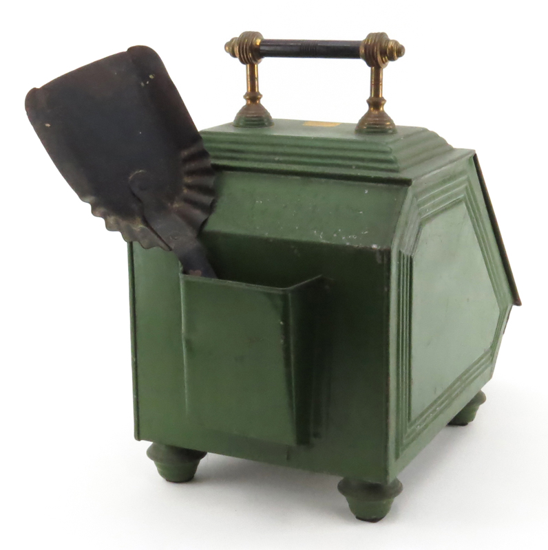 Antique Painted Metal Coal Scuttle With Shovel. Unsigned. Good antique condition with wear and Rubbing. Measures 18" H x 11-1/2" W x 16-3/4" D. Shipping: Third party. (estimate $50-$100)