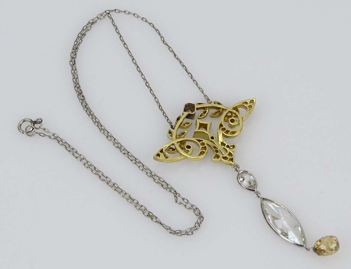 Antique Platinum and 18 Karat Yellow Gold Pendant Necklace Set with an Approx. 2.40 Carat Marquise Cut Diamond, 1.50 Carat Fancy Yellowish Brown Briolette Cut Diamond and further accented with 2.25 Carat Diamonds.