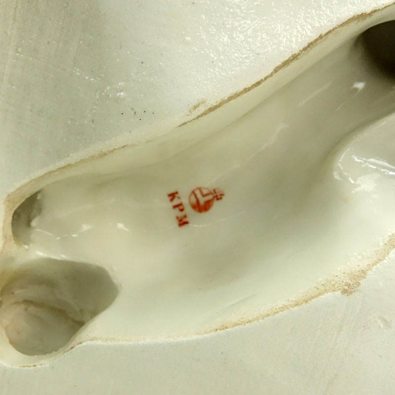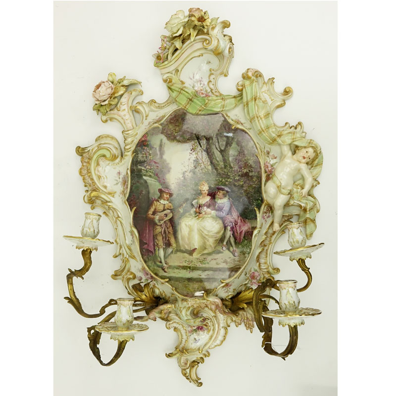 Antique KPM Hand Painted Porcelain Sconce. Features a large center plaque featuring a courting scene, framed by an elaborate floral and putti border and 4 lights. Signed with KPM mark. Typical losses and wear or in overall good condition. Measures 34" L x 21" W. Shipping: Third party. (estimate $3000-$5000)