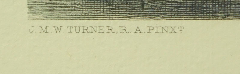 Three (3) After: J M W Turner, British (1775-1851) R. A. Pinx Colored Prints. Includes: "Venice", "The Grand Canal", and "The Bridge of Sighs". Needs minor cleaning, good condition. Each measures 8-1/2" H x 11-1/2" W, frames measure 15" H x 19-3/4" W. Shipping $145.00 (estimate $100-$200)