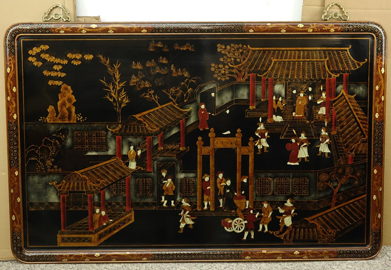 Maitland-Smith (Mid. 20th C.) Chinese Black Lacquered Wall Panel. Decorated with a courtyard scene of figures and architecture, printed paper label "Handmade in Hong Kong by Maitland-Smith LTD" on obverse side. Minor rubbing otherwise good condition. Measures 36" H x 56" W. Shipping: Third party. (estimate $300-$500)