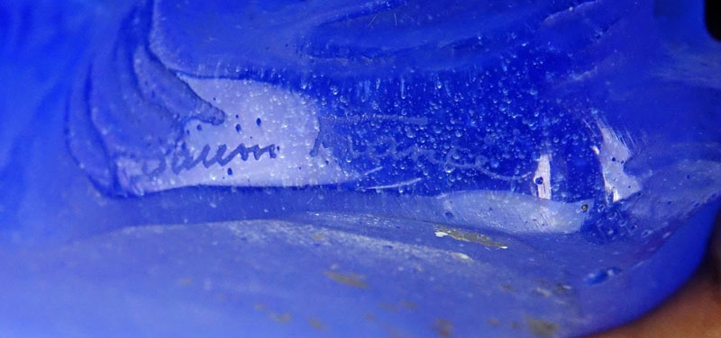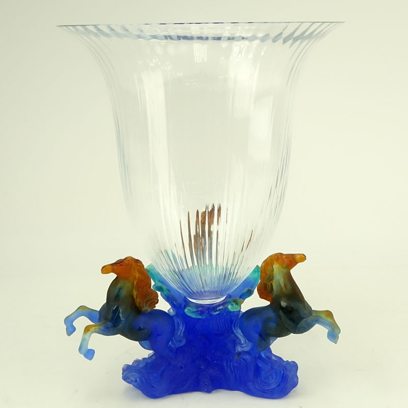 Daum Marly Blue Crystal and Pate de Verre Centerpiece Vase in Original Fitted Box. Signed "Daum France" at the base. Small Daum pamphlet included. Few repairs to legs one horse otherwise good condition. Vase measures 14-3/4" H x 11" W, box measures 16" H x 16" W x 16" Depth. Shipping: Third party (estimate $1100-$1500)