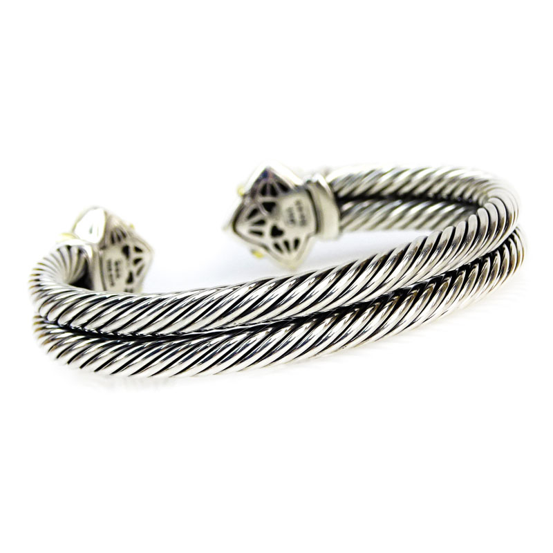David Yurman Ruby, Carved Back Onyx, 18 Karat Yellow Gold and Sterling Silver Double Cable Cuff Bangle. Signed. Very good condition. Measures 2-1/4" interior diam., 5/8" W. Approx. weight: 48.2 grams. Shipping $30.00 (estimate $500-$800)