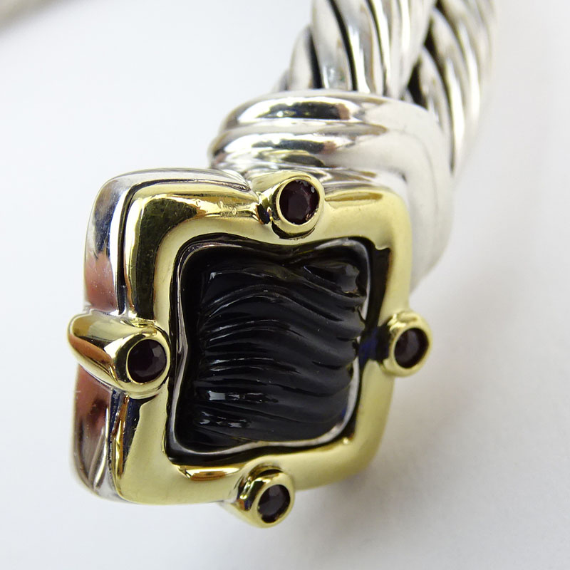 David Yurman Ruby, Carved Back Onyx, 18 Karat Yellow Gold and Sterling Silver Double Cable Cuff Bangle.