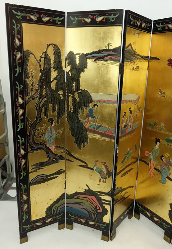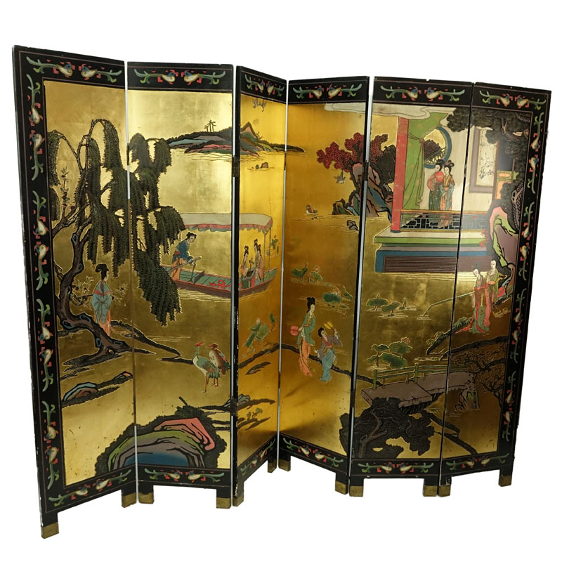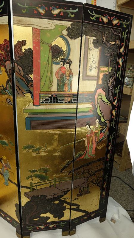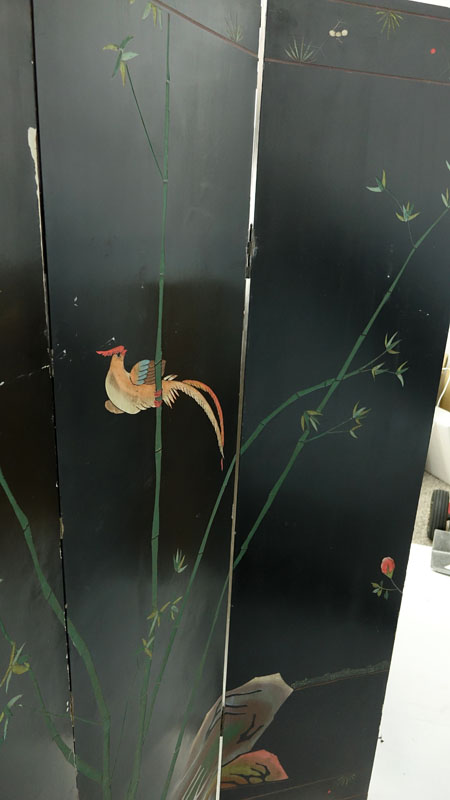 20th Century Six (6) Panel Chinese Screen. Carved and painted decoration. Unsigned. Wear and paint loss. Measures 72-1/2" H x 96" W. Shipping: Third party. (estimate $300-$400)