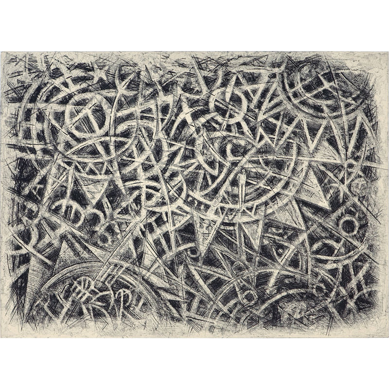 European School Etching "Abstract" Signed lower left and numbered 11/50 in pencil. Toning from age. Full sheet measures 15-1/2" x 19-1/2", mat measures 16-1/4" x 20". Shipping $85.00 (estimate $200-$300)