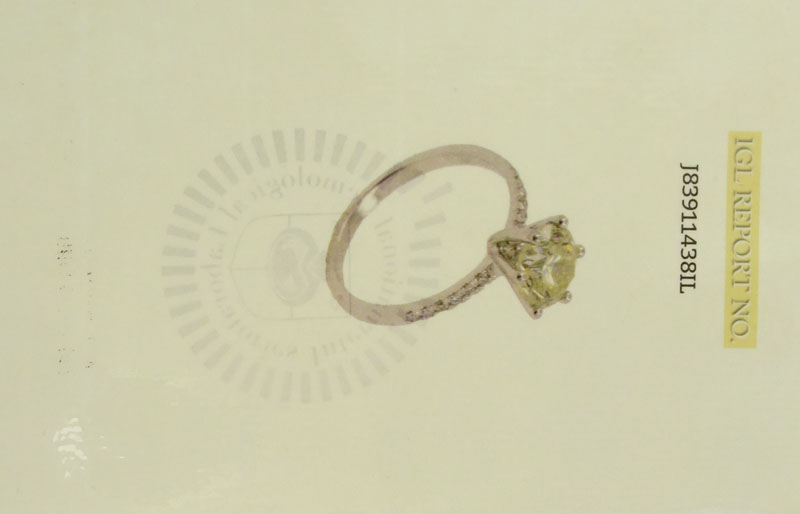 IGL Certified 1.74 Carat Round Brilliant Cut Diamond and 14 Karat White Gold Engagement Ring. Diamond J color, I1 clarity. Signed 14K. Very good condition. Ring size 5-1/2. Approx. weight: 2.0 grams. IGL Report J839114381L dated 1/30/17 to accompany this lot. Shipping $30.00 (estimate $3000-$4000)