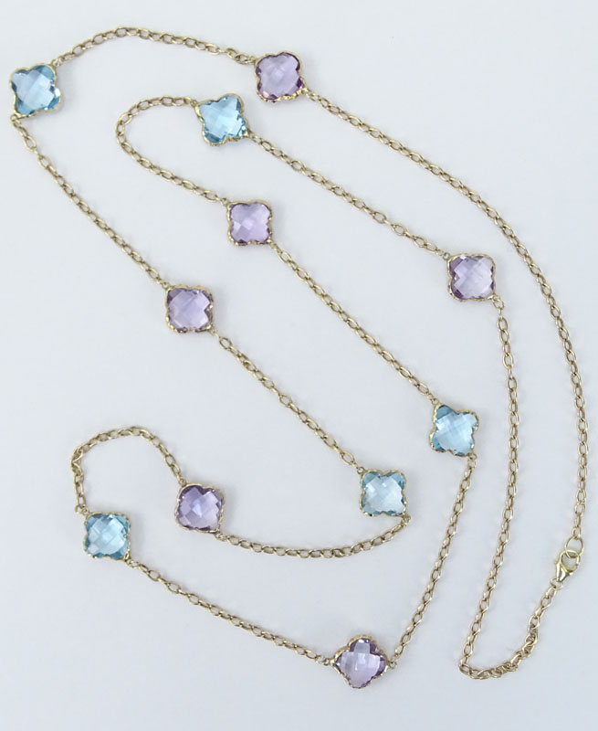 Vintage Amethyst, Blue Topaz and 14 Karat Yellow Gold Quatrefoil Necklace. Signed 585. Good condition. Measures 1/2" W, 36" L. Approx. weight: 15.4 grams. Shipping $30.00 (estimate $650-$850)