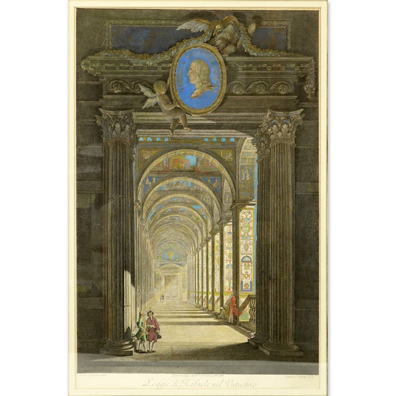After: Raffaello Sanzio, Italian (1483-1520) Delle Logge di Rafaele nel Vaticano Color Engraving. Sculp. by Volpato after a drawing by Camporesi, Title lower. Toning to paper, slight foxing. Measures 24 x 15-3/4" W (sight), frame measures 33" H x 25" W. Shipping: Third party. (estimate $100-$200)