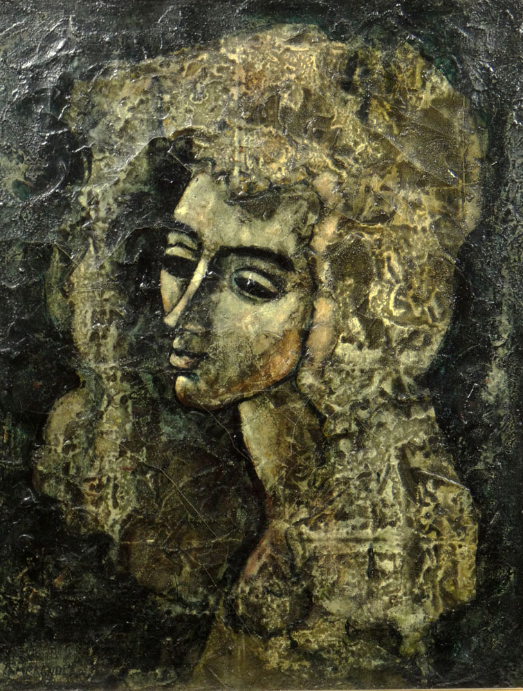 Enrico Campagnola, Swiss (1911-1984) Oil on Canvas "Portrait of a Woman". Signed Lower Left. Craquelure Otherwise Good Condition. Measures 23-7/8 Inches Tall and 19-3/4 Inches Wide, Frame Measures 27-3/8 Inches Tall and 23-1/8 Inches Wide. Shipping $165.00 (estimate $200-$300)