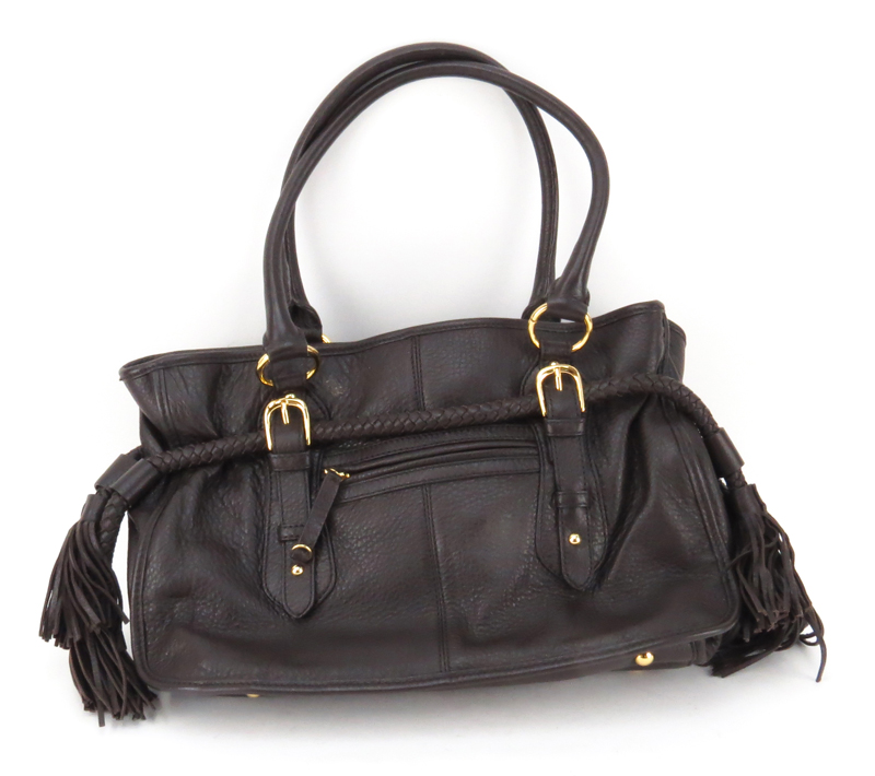 Adrienne Vittadini Cowhide and Leather Bag. Satin interior with zipper and slot pockets, magnetic closure. Marked appropriately. Gently used condition, light soiling. Measures 9-1/2" H x 15-1/4" L x 5-1/4" D. Dust bag included. Shipping $54.00 (estimate $50-$100)