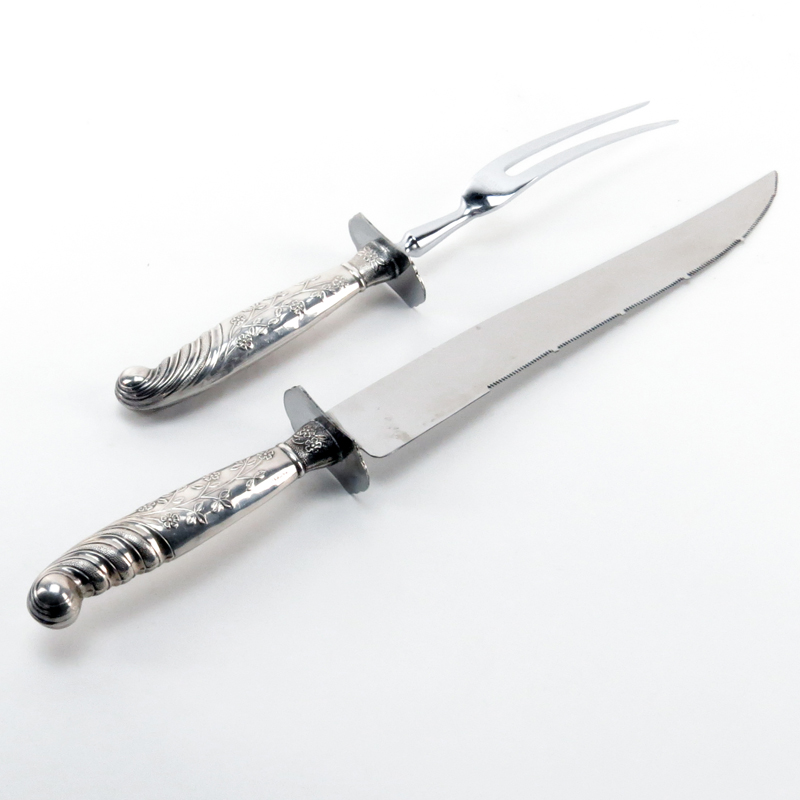 Ambassador Cutlery Mfg. & CO Sheffield England Sterling Silver Handle Carving Set. Stamped on handle. Good condition. Knife measures 13-3/4" Long, fork measures 10" Long. Shipping $38.00 (estimate $25-$50)