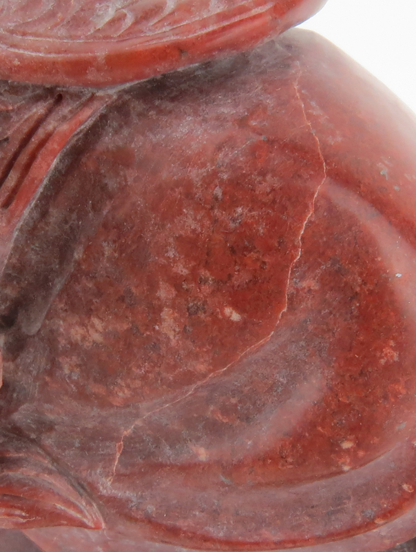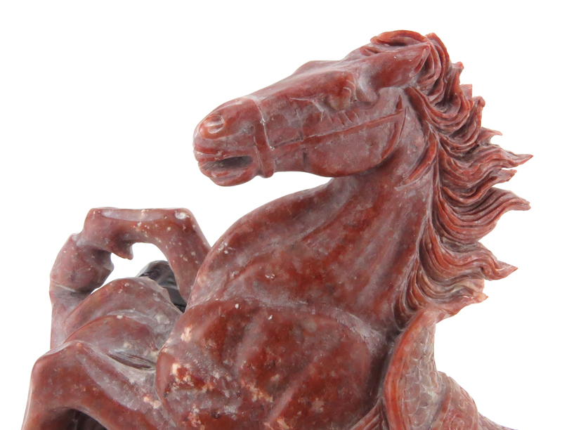 Hand Carved Chinese Natural Shoushan Stone Horse Figurine On Carved Wood Base. Unsigned. Good condition. Measures 11" H, with base it measures 14-1/2" H. Shipping $68.00 (estimate $400-$600)