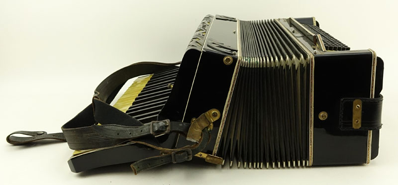 Vintage Roberto Mother of Pearl Accordion in Excelsior Traveling Hardcase. Mother of pearl keys and back trim. Includes extra straps and Modern Accordion Solos book by Olive Blossoms. Top trim near buttons is slightly coming apart otherwise minor rubbing to body. Accordion measures 8" H x 20-1/4" W, case measures 19" H x 23" W x 10" Depth. Shipping: Third party (estimate $100-$200)