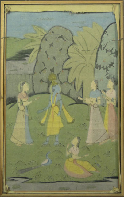20th Century Indian Painting on Cotton Fabric Depicting Krishna in a Garden Scene. Unsigned. Small Tear to Fabric Top Center and Side Edge Otherwise Good Condition. Measures 49-1/2 Inches Tall and 30-1/4 Inches Wide, Frame Measures 52 Inches Tall and 32 Inches Wide. We will not ship this item due to its size. We will happily recommend a list of outside vendors upon request. (estimate $50-$100)