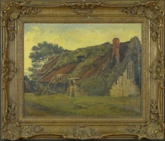 19th Century Unsigned Continental Oil on Canvas "Thatched Hut with Young Girl" Unsigned. Good to Very Good Condition. Measures 13 Inches by 15-1/4 Inches, Frame Measures 18 Inches by 21 Inches. Shipping $145.00 (estimate $200-$300)