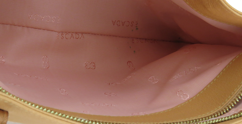 Escada Peach/Salmon Leather Top Handle Handbag. Features zipper closure, monogrammed fabric interior, gold-tone hardware. Marked appropriately. Gently used condition with minor soiling. Measures 7" H x 12-1/4" W x 3-1/8" D. Dust bag included. Shipping $52.00 (estimate $150-$200)