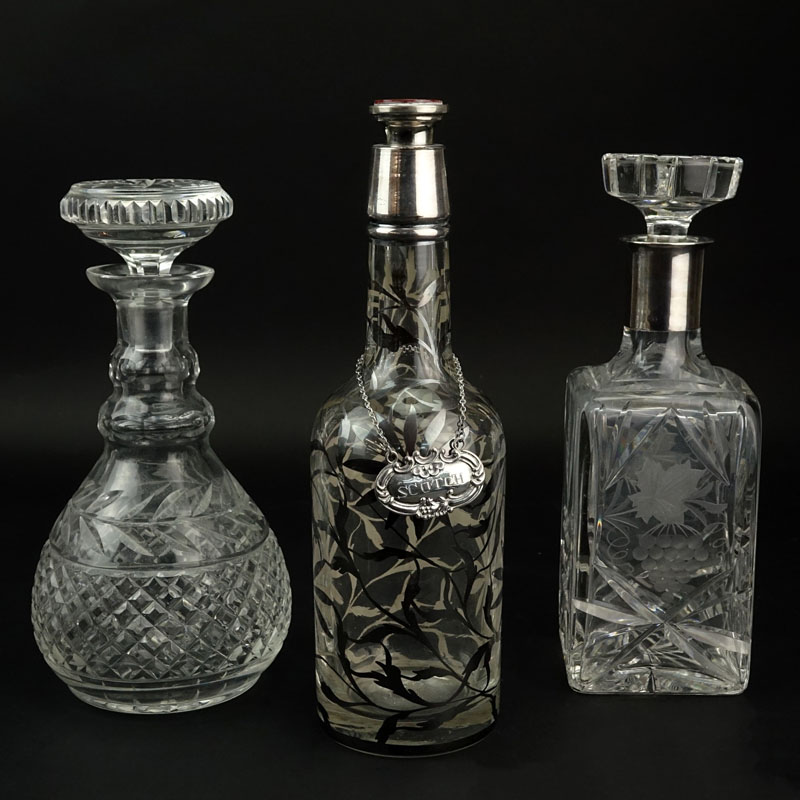 Grouping of Three (3) Decanters. Includes: two etched crystal and one overlay decanter.Grouping of Three (3) Decanters. Includes: two etched crystal and one overlay decanter.Grouping of Three (3) Decanters. Includes: two etched crystal and one overlay decanter.Grouping of Three (3) Decanters. Includes: two etched crystal and one overlay decanter.