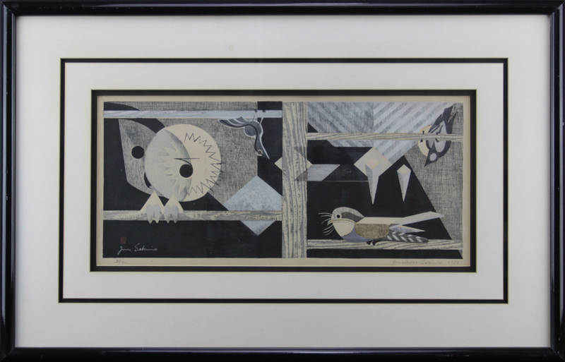 Junichiro Sekino, Japanese (1914-1988) Color Woodcut "Illusion of Birds" Pencil Signed and Numbered 26/50. Depicts a surreal scene of several birds perched on wood. Good condition. Measures 11" H x 23-1/4" W (sight), frame measures 22" H x 32-1/2" W. Shipping: Third party (estimate $300-$400)