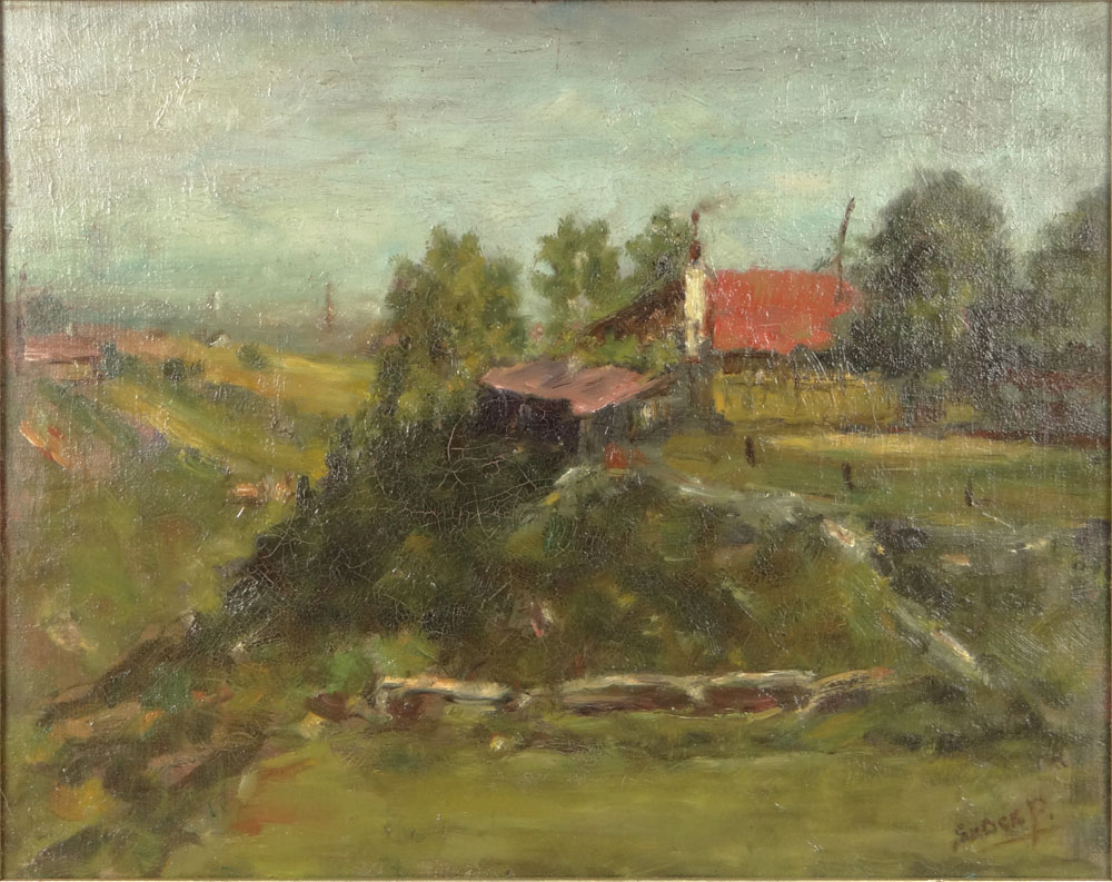 20th Century Continental School Oil on Board "Landscape with Barn" Possibly Russian. Signed Lower Right Illegible. Letter to a Friend Attached en Verso. Good to Very Good Condition. Measures 16 Inches by 20 Inches, Frame Measures 20 Inches by 24-1/8 Inches. Shipping $145.00 (estimate $150-$250)