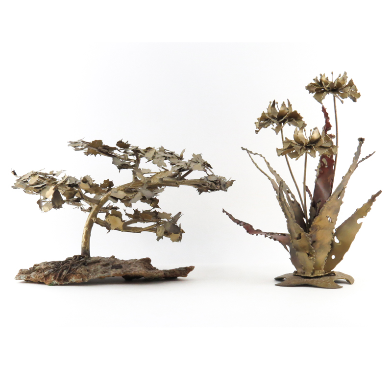 Two (2) Mid Century Brass Sculptures. One a bonsai tree signed Guilara, Good condition. Measures 12" H x 16" L. The other a flower group, unsigned, good condition, measures 18". Shipping: Third party (estimate $50-$100)