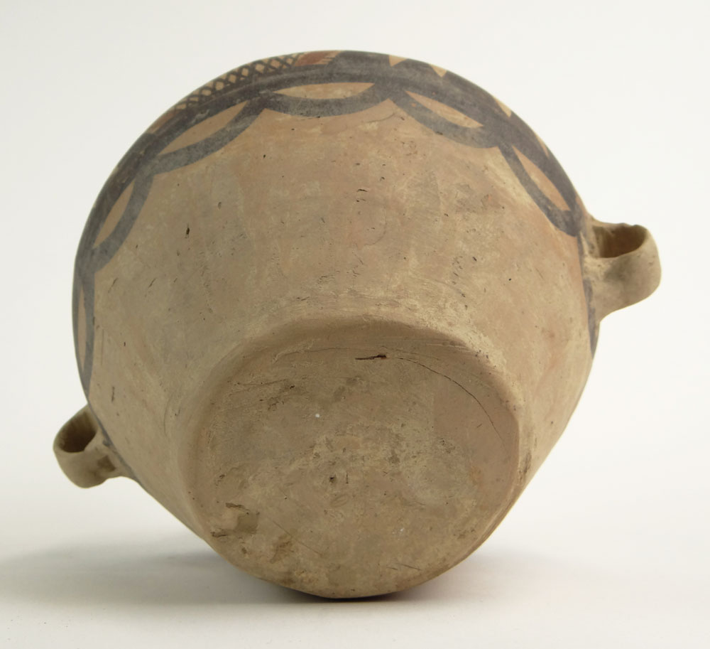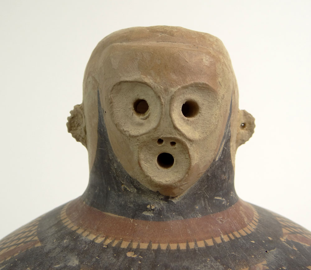 Antique Pottery Vessel with Red and Black Decoration, Loop Handles and Stylized Head to Neck.
