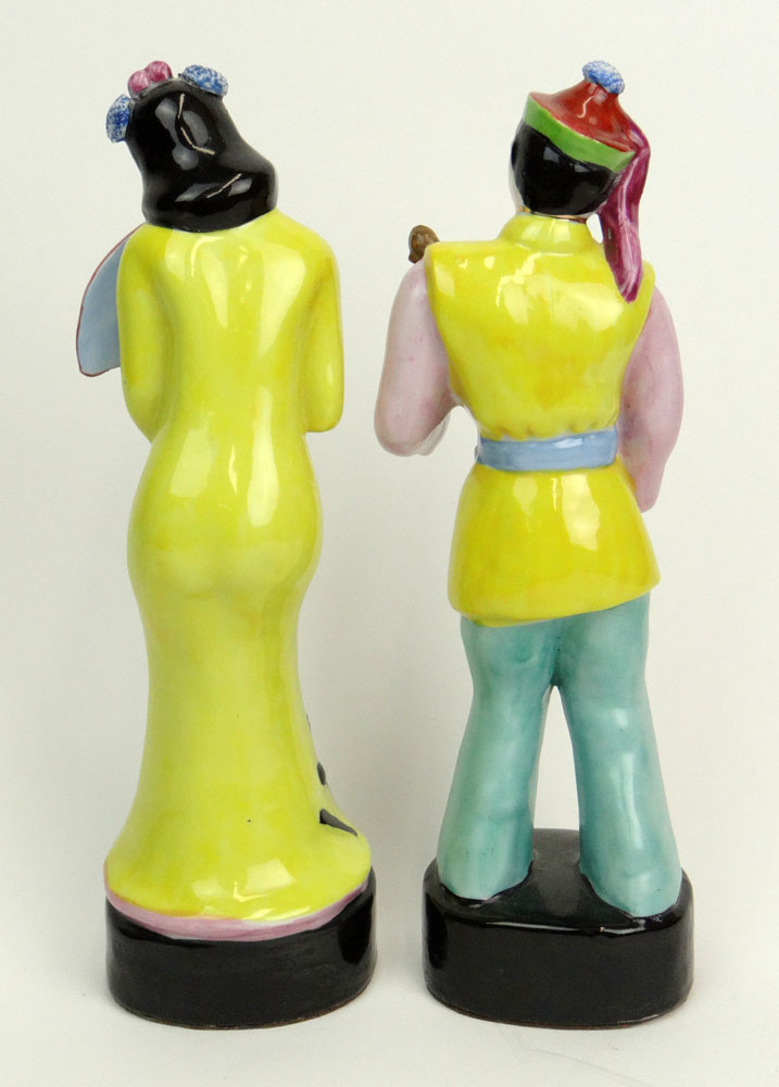 Pair of Retro Chinese Hollywood Regency Style Porcelain Figural Groups of Young Girl with Fan and Young Boy with Instrument. Unsigned. Measures 12" H. Good to Very Good Condition. Shipping $68.00 (estimate $50-$100)