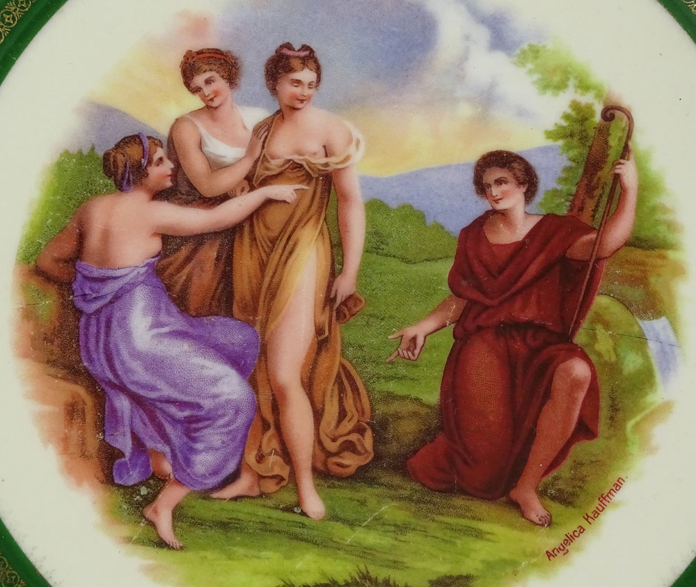 Antique Royal Vienna Porcelain Plate With Classical Transferred Motif by Angelica Kauffman. Signed With Blue Beehive mark and Green Backstamp. Light wear or in Good Condition. Measures 11-1/4 Inches Diameter. Shipping $55.00 (estimate $50-$100)