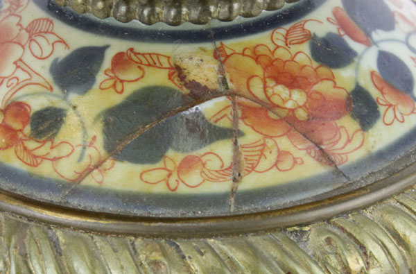 Antique Bronze Mounted Japanese Imari Porcelain Covered Jar As Lamp. No visible signature. Damage to "Iid". Possibly converted from an oil lamp to electric. Measures 15" to socket. Shipping $68.00 (estimate $100-$150)