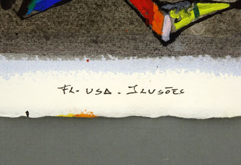 Marco Figueiredo, Brazilian (20th Century) Watercolor and gouache on paper “FL – USA – Ilusoes”. Signed and dated ’10 lower right. Inscribed and titled. Good condition. Measures 20” x 16”, frame measures 27-1/4” x 23”. Shipping: Third party (estimate $200-$300)