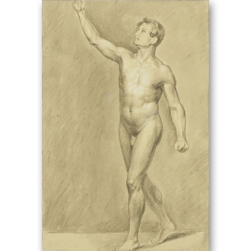 18th Century European School Charcoal With White Highlights On Paper "Male Nude Front View" Unsigned. Creases, light smudging or in good condition. Measures 22-1/4" x 15-1/2". Shipping $165.00 (estimate $400-$600)