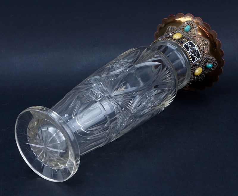 Antique Persian Influences Glass Vase With Cloisonné Bronze Mounting Inset With Gemstones. Gemstones include sapphires, peridot, malachite, garnet, pearls. Unsigned. Flared rim slightly out of round or in good condition. Measures 15-1/2" H. Shipping $85.00 (estimate $500-$700)