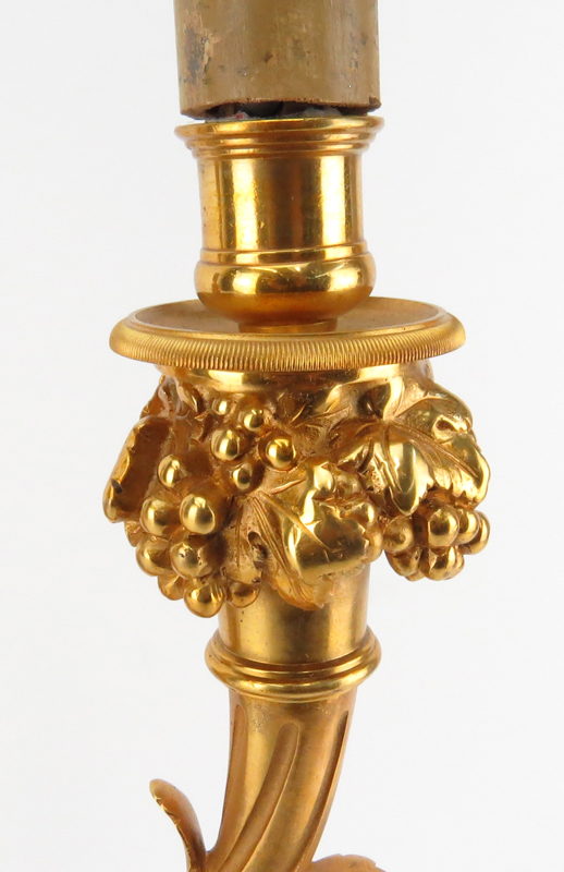 Late 19th Century Two Arm Gilt Bronze Putti Lamp on Marble Base. Depicts a jovial putti figure with branches and drip cups modeled with grapevines, has been electrified. Wear to patina. Measures 18" H x 10" W. Shipping $135.00 (estimate $350-$550)