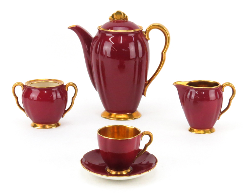 Fifteen (15) Piece Carlton Ware Rouge Royale Porcelain Coffee Set. Includes: 6 cups, 6 saucers, mini coffee pot, sugar and creamer. Dark red with gold trim. Signed and numbered 1582 on underside. Sugar missing lid, needs cleaning. Coffee pot measures 8" H x 7" W. Shipping $85.00 (estimate $50-$100)