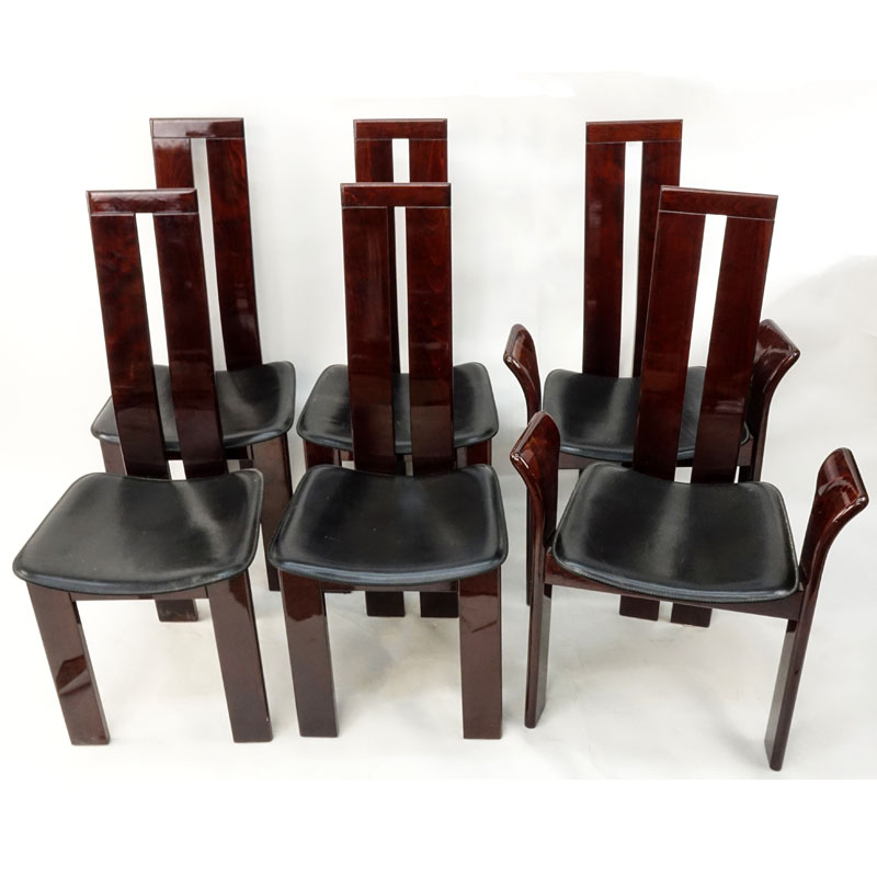 Set of Six (6) Pietro Costantini, Italy, circa 1970's Dining chairs. Lacquered wood with stitched black saddle leather seats. Signed. In good condition with minor signs of age and use. Measures 42" H x 18" W x 16-1/2" D. Shipping: Third party. (estimate $600-$900)