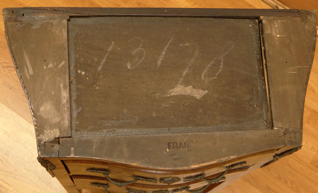 Small 20th Century French Louis XV style Bronze Mounted Marquetry Inlaid Bombe Commode with Two (2) Drawers and Marble Top. Signed Made in France. Veneer Loss to One Side and Rubbing Otherwise Good Condition. Measures 31 Inches Tall and 25-1/2 Inches Wide. Shipping: Third Party. (estimate $300-$500)