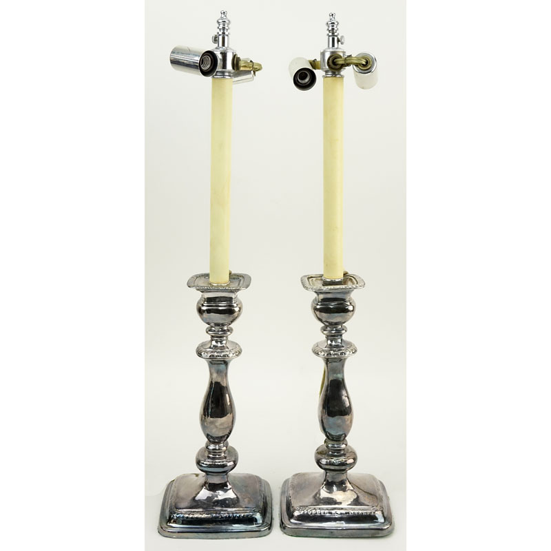 Pair of Vintage Silver Plate Candle Sticks Now As Lamps. Unsigned. Light dings or in good condition. Sticks measure 11-3/4" H. Shipping $65.00 (estimate $100-$150)
