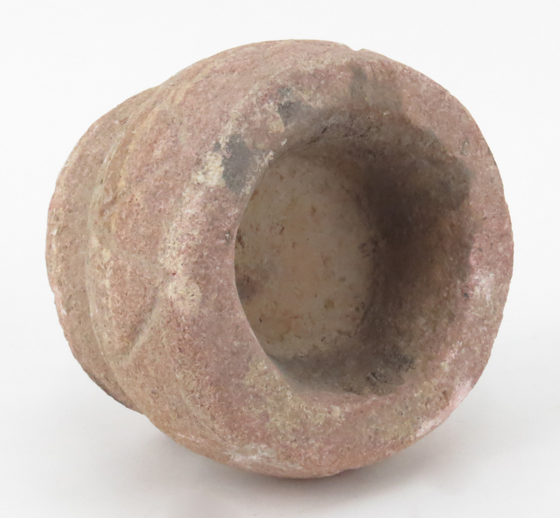Pre Columbian Stoneware Vessel on Wrought Iron Stand. Natural wear to patina. Vessel measures 4-1/2 x 5-7/8" W, stand measures 7-7/8 x 6" W. Shipping $66.00 (estimate $150-$250)