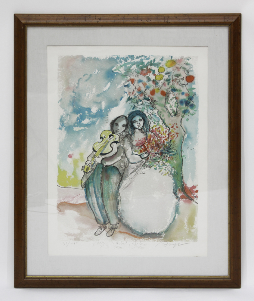 Pencil Signed and Numbered Color Lithograph of a Courting Scene in the Style of Marc Chagall. Artist signature and title are illegible. Good condition. Measures 28-1/2" H x 21" W. Frame measures 37-1/2" H x 30" W. Shipping: Third party (estimate $100-$150)