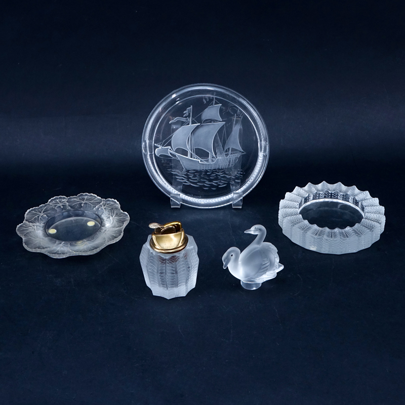 Lot of Five (5) Lalique Crystal Tabletop Items. Includes: 2 pc "Jamaique" smoking set, "Duex Cygne" paperweight, "Hornfleur" ashtray, "Santa Maria" ashtray. All pieces signed and in good condition. "Santa Maria" measures 6-3/4" Dia. Shipping $65.00 (estimate $100-$200)