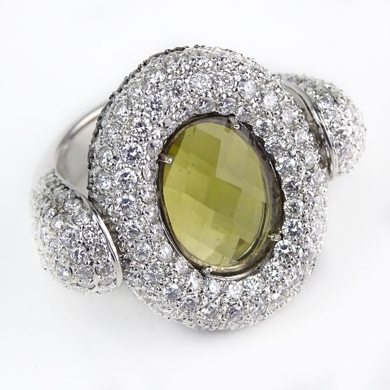 Approx. 4.44 Carat Pave Set Diamond, 3.39 Carat Pave Set Round Black Diamond, 8.46 Carat Oval Cut Citrine and 18 Karat White Gold Reversible Ring. Stamped 750. Very good condition. Ring size 7. Approx. weight: 20.9 grams. Shipping $28.00 (estimate $4000-$6000)
