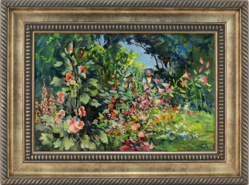20th Century Oil on Canvas, Landscape with Flowers. Artist monogram lower right CA, possibly Cuno Amiet, Swiss (1868-1961). Good condition. Measures 15" H, 21-3/4" W; frame measures 21-3/4" H, 29" W. Shipping $165.00 (estimate $600-$800)