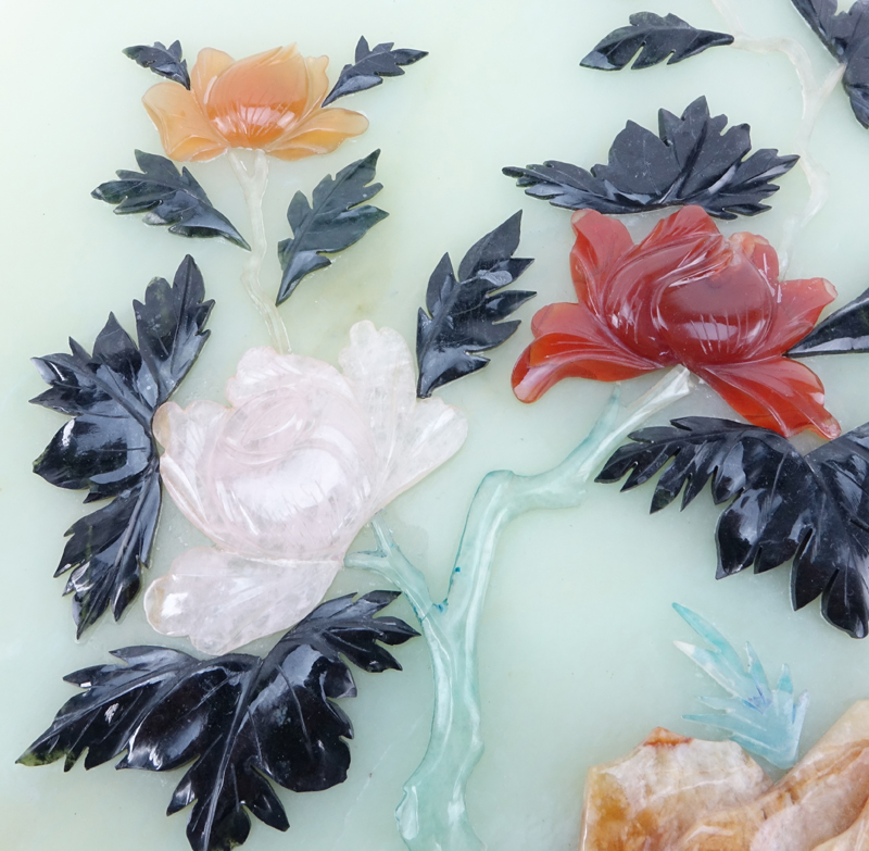 Vintage Chinese Jade and Semi-Precious Stone Round Plaque On Carved Wood Stand. Good condition. Measures 17-3/4" H, the plaque measures 12-1/2" Dia. Shipping $85.00 (estimate $200-$300)