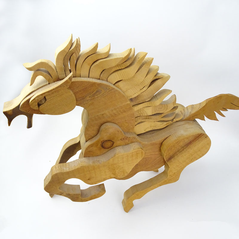 Large Contemporary Wood Carved Galloping Horse Sculpture. Signed M.C. Masina? and numbered 5 on underside. Natural nicks and wear to wood. Measures 30" H x 35-1/2" W x 8" Depth. Shipping: Third party. (estimate $100-$150)