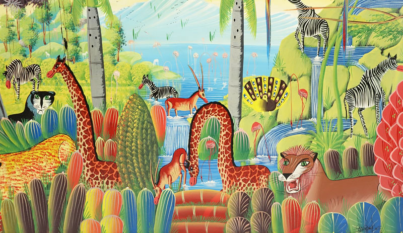 Contemporary Haitian Acrylic On Canvas "Jungle Scene" Signed lower right Jacky ____.